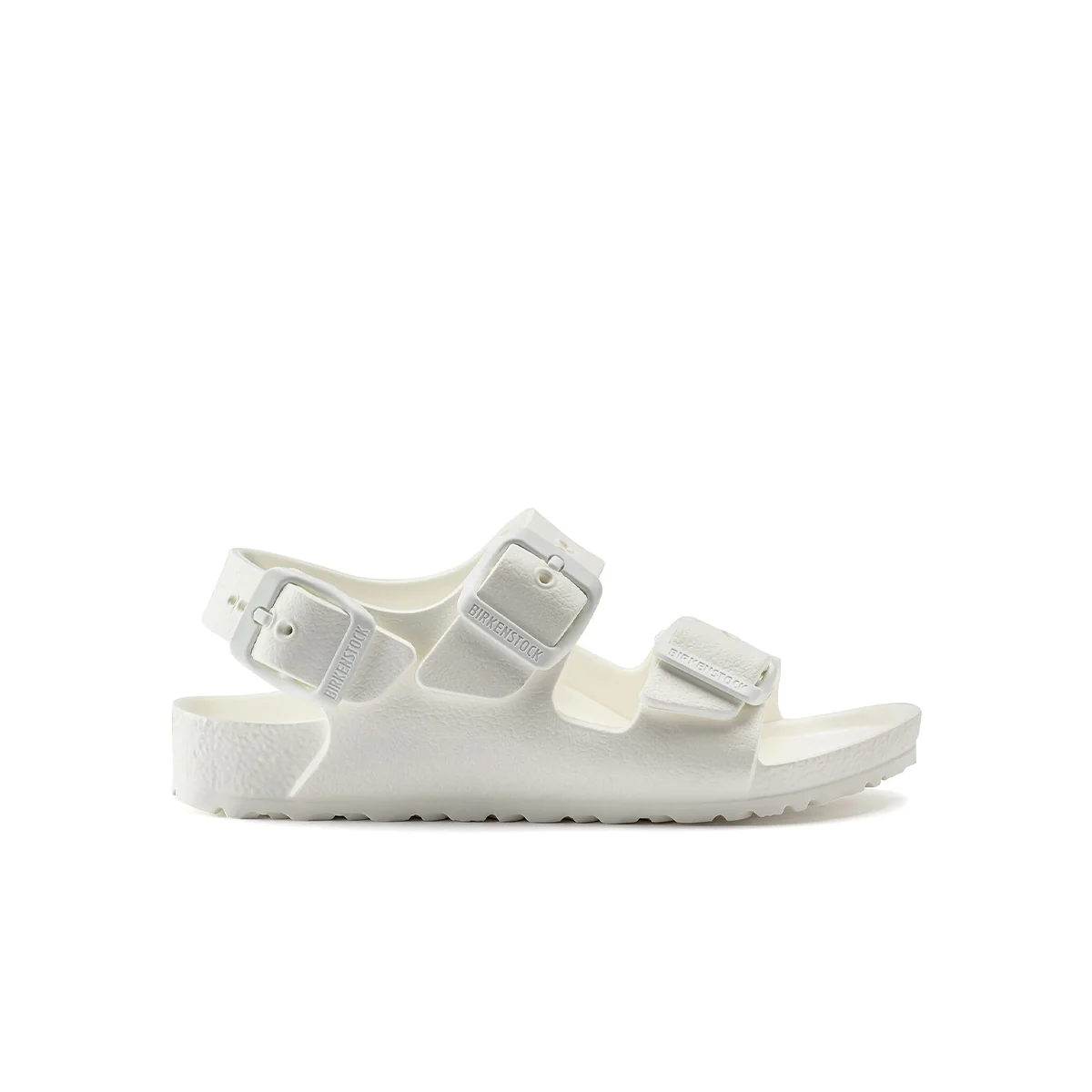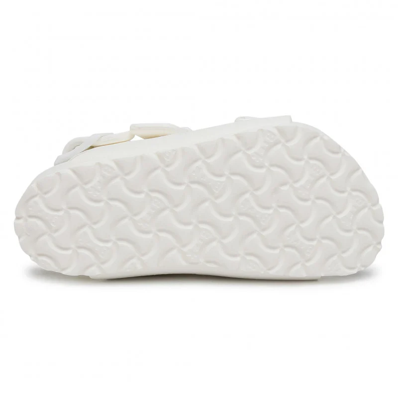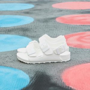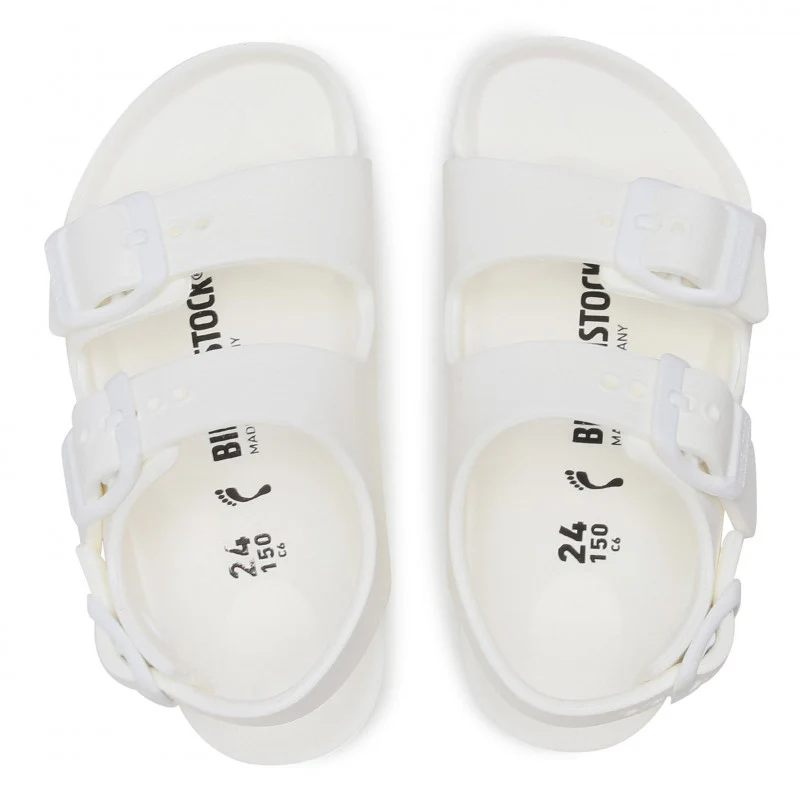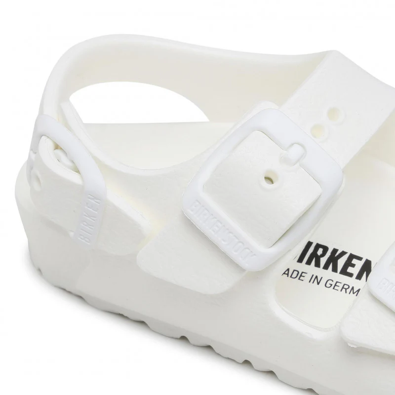 סנדלי בירקנשטוק מקוריים מדגם Milano EVA Playground לילדים בצבע לבן. בשונה מ-Arizona, דגם Milano כולל רצועת עקב נוספת שמעניקה יציבות גבוהה יותר בזמן תנועה.